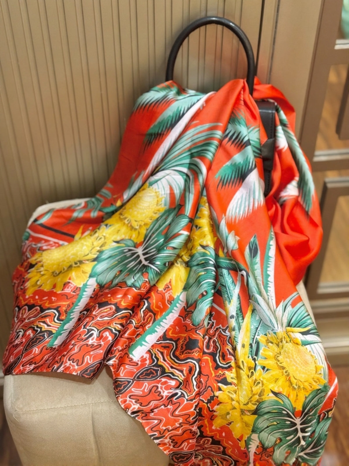 Add a burst of color and island-inspired charm to your wardrobe with the Tropical Bloom Luxury Satin Silk Scarf. Bold orange tones, lush green leaves, and vibrant yellow florals come together to create a refreshing, statement-making accessory perfect for vacations, brunches, and everyday styling.
